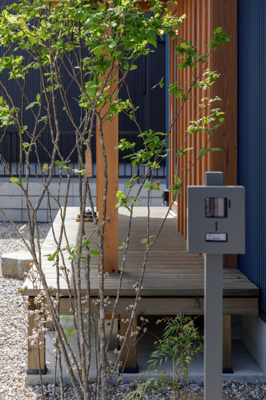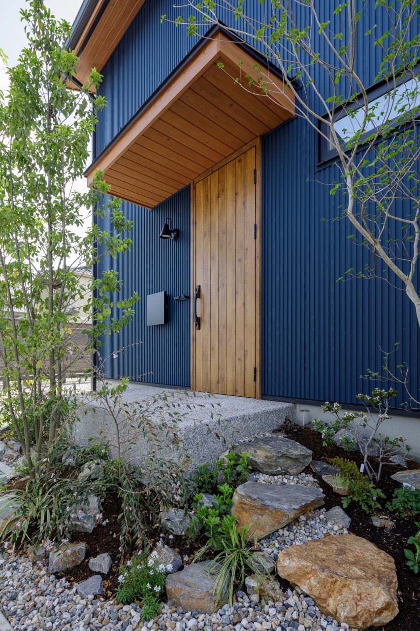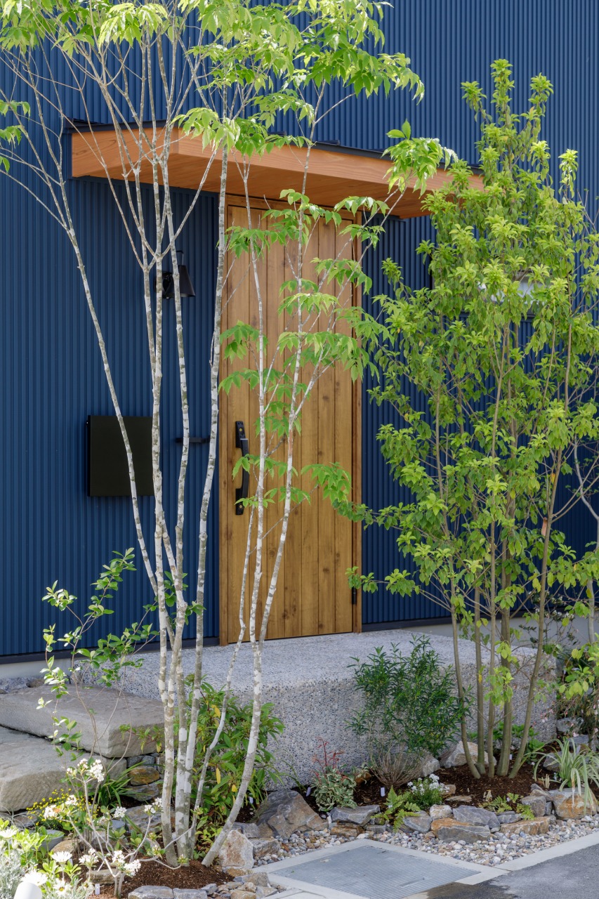 玄関前には背の高い植栽を配置し、さりげなく視線を遮りながら、玄関まわりに心地よい緑を添えています。
