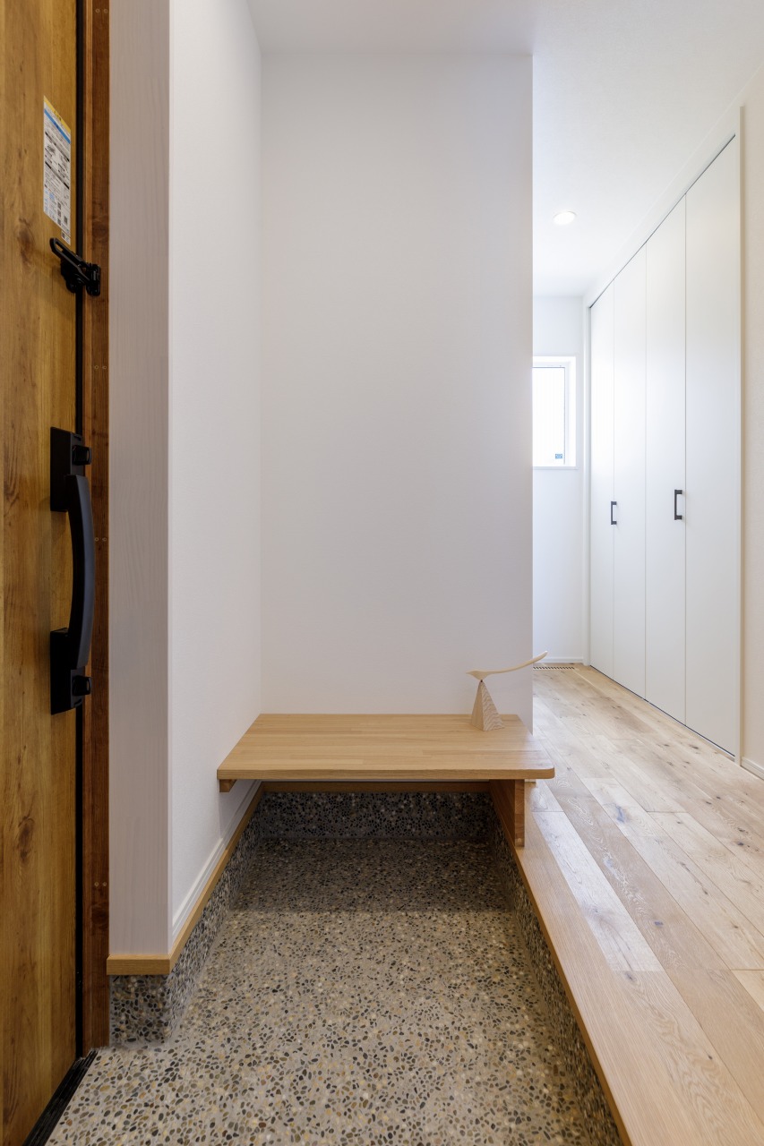 家族と来客、それぞれの動線をきちんと分け、家族のルートにはシューズクロークやアウター掛け、かばん置き場、そして手洗いスペースも。
