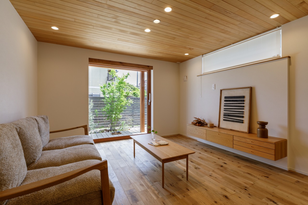 一般的な住宅の天井高が2,400〜2,500mmであるのに対し、こちらのリビングはあえて2,200mmに設定。